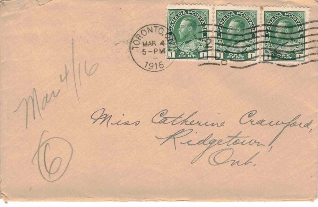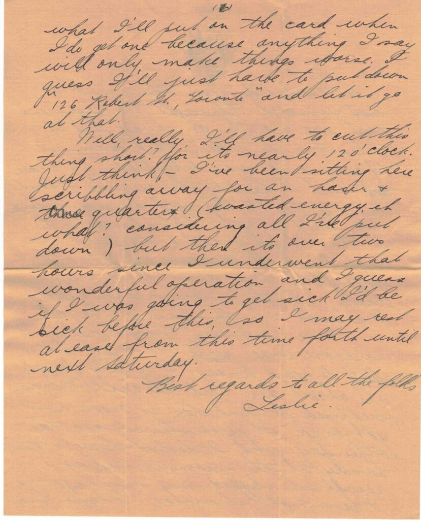 Have you seen Violet lately. I suppose she will be mad now but do you know I really forgot all about her and the card I was supposed to send her as soon as I got back. It just struck me the other day and I didn’t have a card handy at the moment and as a result it slipped my mind again & I haven’t got it since. I don’t know what I’ll put on the card when I do get one because anything I say will only make things worse. I guess I’ll just have to put down “126 Robert St., Toronto” and let it go at that.