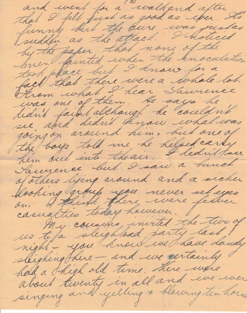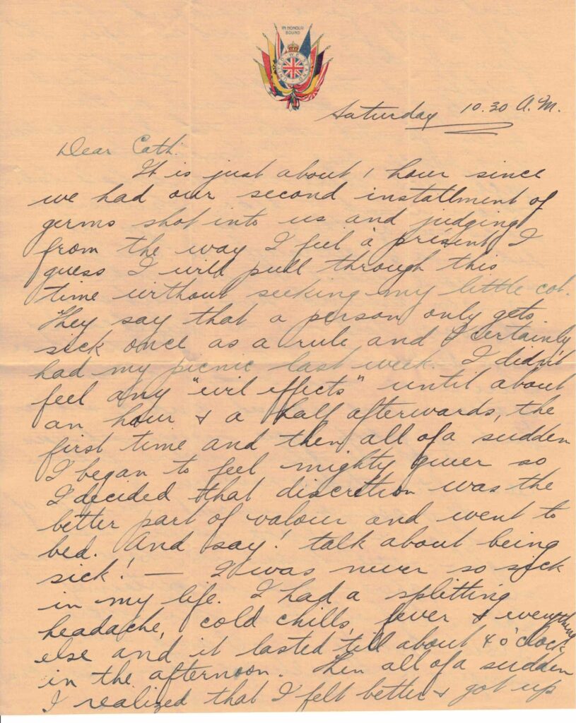 They say that a person only gets sick once as a rule and I certainly had my picnic last week. I didn’t feel any “evil effects” until about an hour & a half afterwards, the first time and then all of a sudden I began to feel mighty queer so I decided that discretion was the better part of valour and went to bed. And say! talk about being sick! — I was never so sick in my life. I had a splitting headache, cold chills, fever & everything else and it lasted ‘till about 4 o’clock in the afternoon. Then all of a sudden I realized that I felt better & got up and went for a walk and after that I felt just as good as ever. It’s funny but the cure was just as sudden as the attack. I noticed by the paper that none of the men fainted when the inoculation took place but I know for a fact that there were a whole lot. From what I hear Lawrence was one of them. He says he didn’t faint although he couldn’t see and didn’t know what was going on around him, but one of the boys told me he helped carry him out into the air. I didn’t see Lawrence but I saw a bunch of others lying around and a sicker looking group you never set eyes on. I think there were fewer casualties today however.