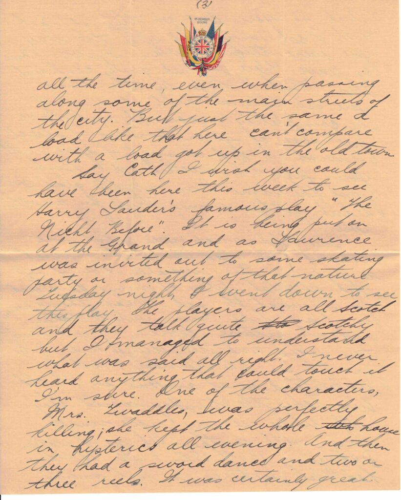 Say Cath I wish you could have been here this week to see Henry Lauder’s famous play “The Nicht Before.” It is being put on at the Grand and as Lawrence was invited out to some skating party or something of that nature Tuesday night, I went down to see this play. The players are all Scotch and they talk quite Scotchy but I managed to understand what was said all right. I never heard anything that could touch it I’m sure. One of the characters, Mrs. Twaddles, was perfectly killing; she kept the whole house in hysterics all evening. And then they had a sword dance and two or three reels. It was certainly great.