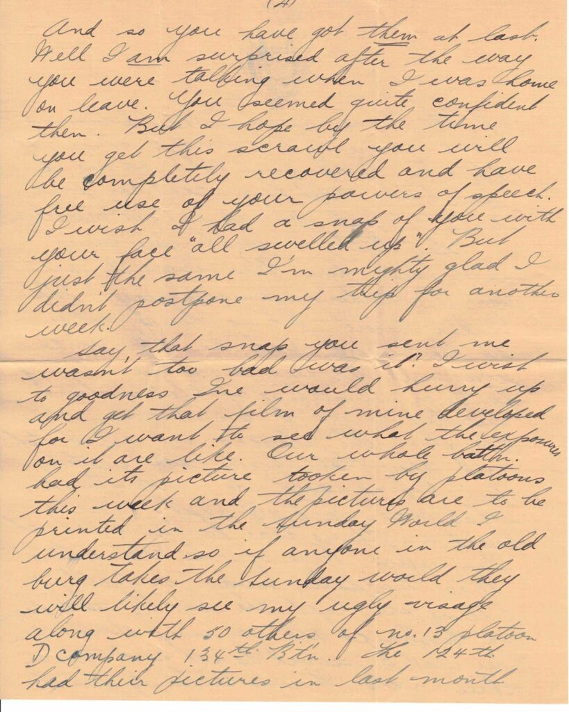 Say, that snap you sent me wasn’t too bad was it? I wish to goodness Ine would hurry up and get that film of mine developed for I want to see what the exposures on it are like. Our whole battn. had its picture tooken by platoons this week and the pictures are to be printed in the Sunday World I understand so if anyone in the old [burg?] takes the Sunday World they will likely see my ugly visage along with 50 others of no. 13 platoon D Company 134th Bt’n.