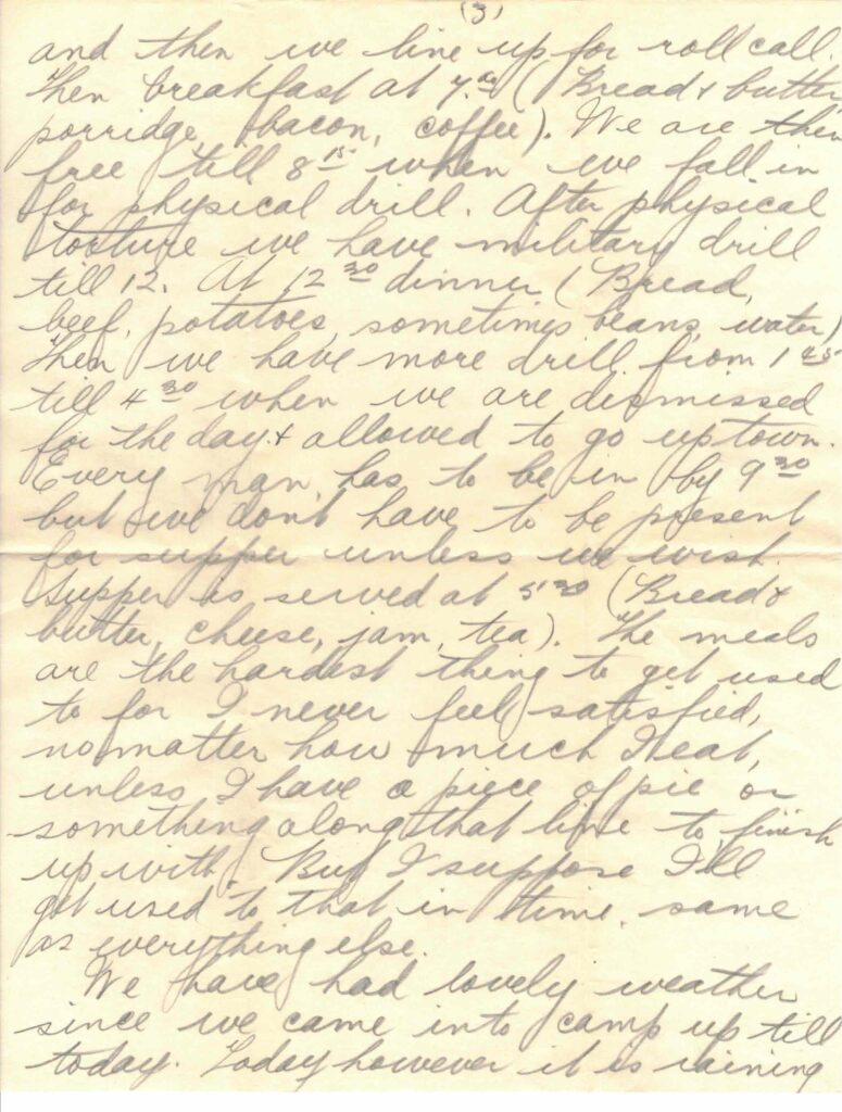 We moved into our new quarters here Tuesday afternoon and by this time have become quite accustomed to camp life. But the first night was enough to jar anybody’s feelings. You see we sleep in wooden bunks arranged in long rows and each man is supposed to have three blankets but the first night there were not enough blankets through somebody’s mistake and we only got one each. So we had to sleep on our bare bunks (they are made of nice soft pine) with one blanket over us and a kit bag for a pillow. Besides that to make matters worse a lot of silly mutts kept singing & yelling nearly all night so you may imagine how much I slept. I know I was awake till 3.15 and then I dropped into a snooze which lasted till a few minutes after 4 and after that I couldn’t sleep because of the noise around us so I got up. Believe me, I never felt so stiff & sore in my life – you have no idea of what sleeping on a board is like till you try it. But thinks are O.K. now. We have our 3 blankets & the men know enough to keep quiet at night. I sleep right through now and feel as fresh in the morning as though I had slept on a feather bed all night. It’s all in getting used to it and it hasn’t taken long to do that. It might interest you to know what our daily routine is. Well [reville?] sounds at 6 A.M. every man has to roll out. By 6.30 we have to be dressed & have our bunks made-up and then we line up for roll call. Then breakfast at 7.00 (Bread & butter, porridge, bacon, coffee). We are then free till 8.15 when we fall in for physical drill. After physical torture we have military drill till 12. At 12.30 dinner (Bread, beef, potatoes, sometimes beans, water). Then we have more drill from 1.45 till 4.30 when we are dismissed for the day & allowed to go uptown. Every man has to be in by 9.30 but we don’t have to be present for supper unless we wish. Supper is served at 5.30 (Bread & butter, cheese, jam, tea). The meals are the hardest thing to get used to for I never feel satisfied, no matter how much I eat, unless I have a piece of pie or something along that line to finish up with. But I suppose I’ll get used to that in time, same as everything else.