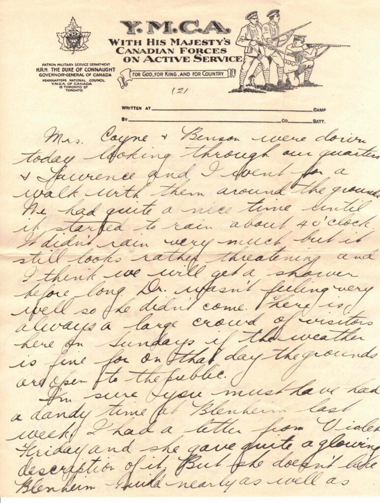 Mrs. Coyne & Benson were down today looking through our quarters & Lawrence and I went for a walk with them around the grounds. We had quite a nice time until it started to rain about 4 o’clock. It didn’t rain very much but it still looks rather threatening and I think we will get a shower before long. Dr. wasn’t feeling very well so he didn’t come. There is always a large crowd of visitors here on Sundays if the weather is fine for on that day the grounds are open to the public.