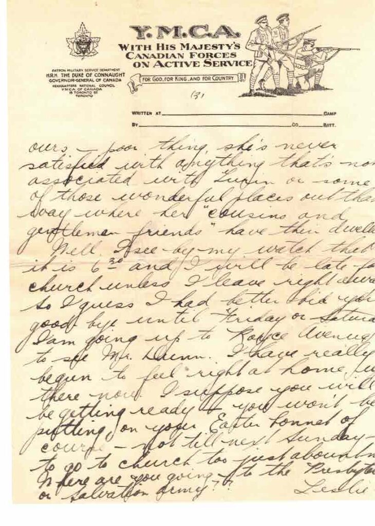 Well, I see by my watch that it is 6.30 and I will be late for church unless I leave right away. So I guess I had better bid you good-bye until Friday or Saturday. I am going up to Royce Avenue to see Mr. Dunn. I have really begun to feel right at home up there now. I suppose you will be getting ready – you won’t be putting on your Easter Bonnet of course – not till next Sunday – to go to church too just about now. Where are you going to the Presbyterian or Salvation Army?
