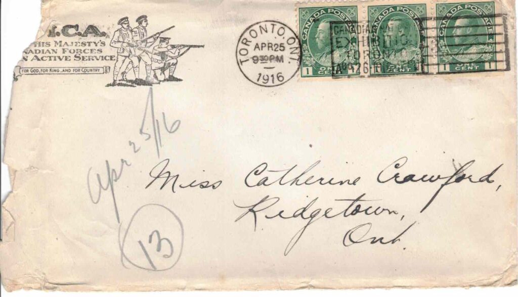 I am certainly writing under difficulties tonight (quite a frequent occurrence I guess eh what?) for the 81st and 83rd battalions are leaving for the front in half an hour and this building is simply jammed full of soldiers and friends who are here to see them off. The noise is enough to discourage anyone trying to write letters. I never saw such a crowd in my life – you would almost think it was exhibition time – the grounds have been crowded all afternoon. I hear that the 92nd Highlanders are on their final leave now and they will likely leave this week.