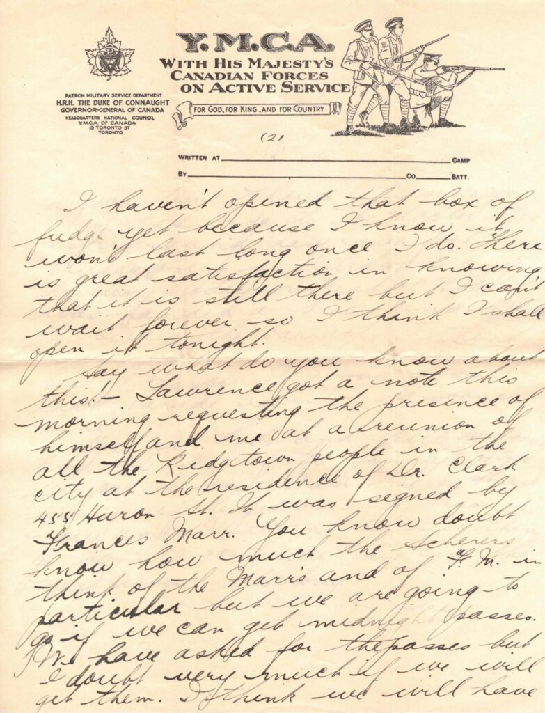 Saw what do you know about this! – Lawrence got a note this morning requesting the presence of himself and me at a reunion of all the Ridgetown people in the city at the residence of Dr. Clark 455 Huron St. It was signed by Frances Marr. You know doubt know how much the Scherers think of the Marr’s and of F.M. in particular but we are going to go if we can get midnight passes. We have asked for the passes but I doubt very much if we will get them. I think we will have a good time though, if we do go.