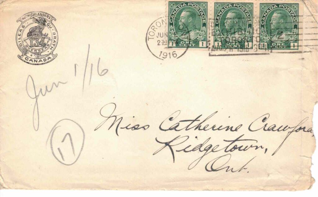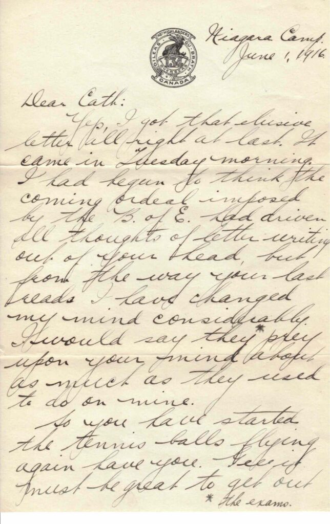I haven’t time to write very much tonight for “lights out” will soon be sounded but I’ll try and put on the high speed and see what I can do. Harry & I got to Windsor Sunday night sharp on time and had exactly 2 hrs, 20 min. to wait for no. 14 so we took a [?] down to Walkerville on the street car. After seeing where Harry & Charles board & have their meals we took another [car?] back to the depot & I left Windsor at 12.10 Monday morning. Well, I tried to get some sleep on the train but as you may imagine it didn’t work very well considering the distance the seats are apart and the fact that I was wearing a kilt. I dozed off for about an hour just after we pulled out of St. Thomas but that’s all the sleep I got between Saturday night and Monday night. I had to wait 4 ½ hours in Niagara Falls (got there at 5.45) so just to pub in time. I took a run down to Chippewa on the trolly but it was so foggy I could hardly see the Falls at all. Got back to camp at 11 a.m. and went on duty at 2. Believe me I turned inright after supper that night and didn’t wink an eye till reveille next morning.