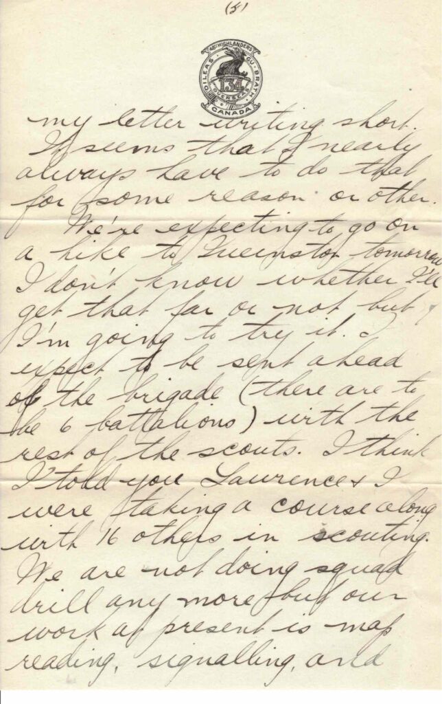 Yesterday the scouts all went shooting and I made 47 points out of 60 although I had never used the heavy field ammunition before and it kicks just like a young cannon. The highest score was 51, so I guess my eyes aren’t going to bother me as much as I expected. In the afternoon the whole battalion marched 3 mi. to the lake and we all went in for a swim. The water certainly isn’t what you’d call “hot” by any means yet. That’s the first time I ever went swimming the second week in June. I got through the 6 mi. O.K. so I guess my troubles are about over. Hope so anyway but the hike to Queenston day after tomorrow will settle that questions. Lawrence is still laid up and I don’t think his knee is a bit better.