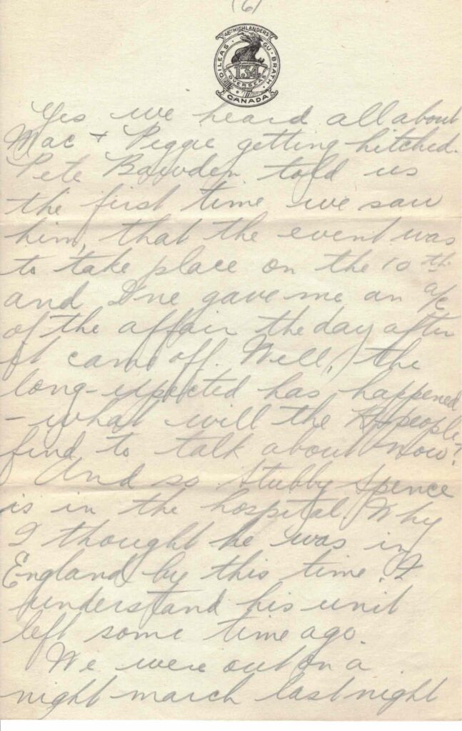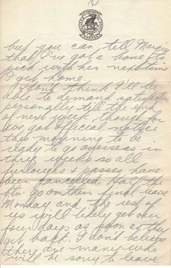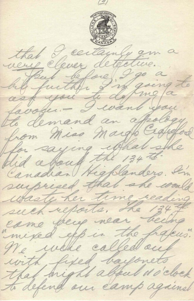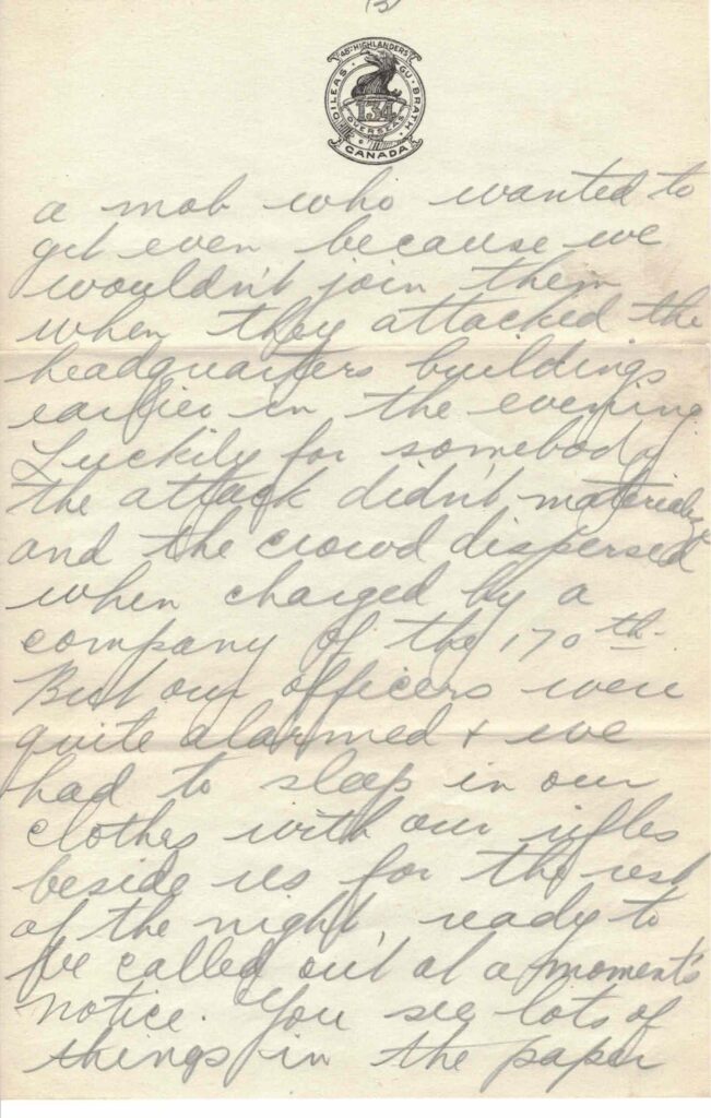 But before I go a bit further I’m going to ask you to do me a favour – I want you to demand an apology from Miss Margs Crawford for saying what she did about the 134th Canadian Highlanders. I’m surprised that she would waste her time reading such reports. The 134th came very near being “mixed up in the fracus.” We were called out with fixed bayonets that night about 11 o’clock to defend our camp against a mob who wanted to get even because we wouldn’t join them when they attacked the headquarters buildings earlier in the evening. Luckily for somebody the attack didn’t materialize and the crowd dispersed when charged by a company of the 170th. But our officers were quite alarmed & we had to sleep in our clothes with our rifles beside us for the rest of the night, ready to be called out at a moment’s notice. You see lots of things in the paper but you can tell Margie that I’ve got a bone to pick with her next time I get home.