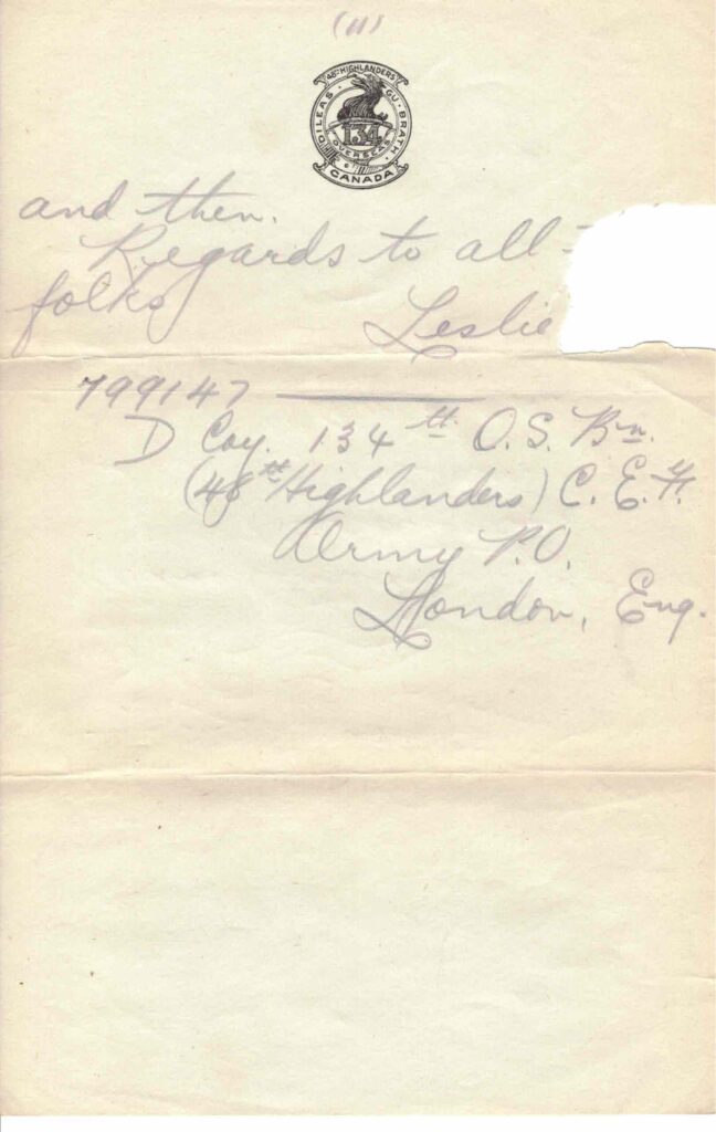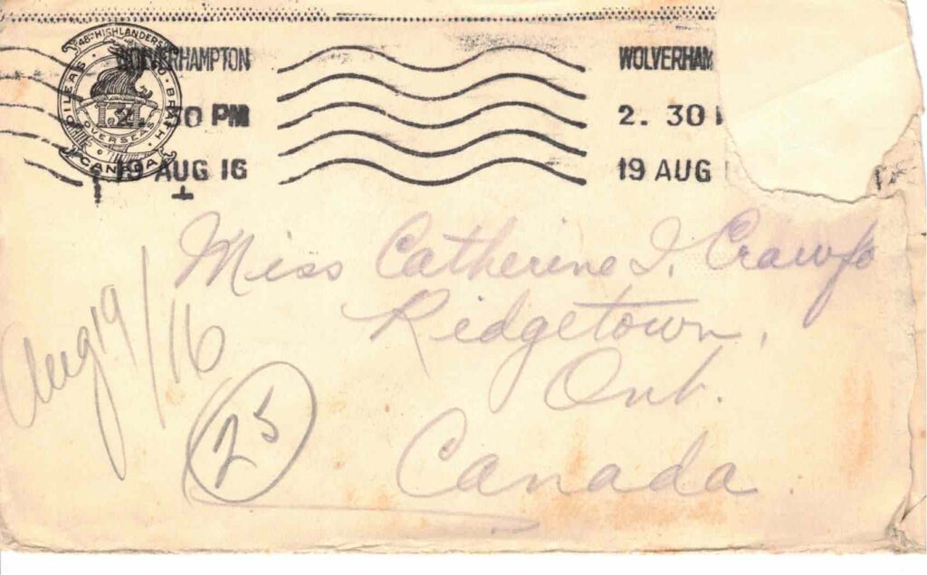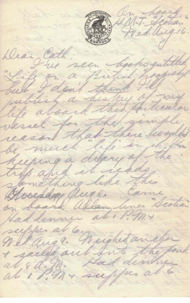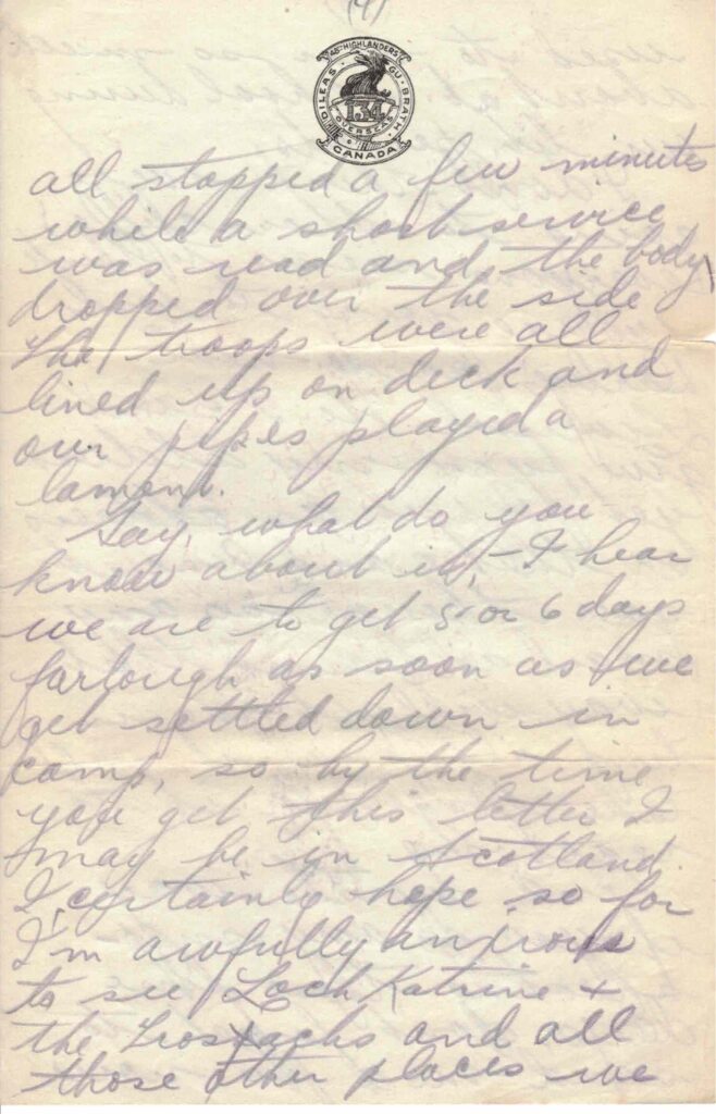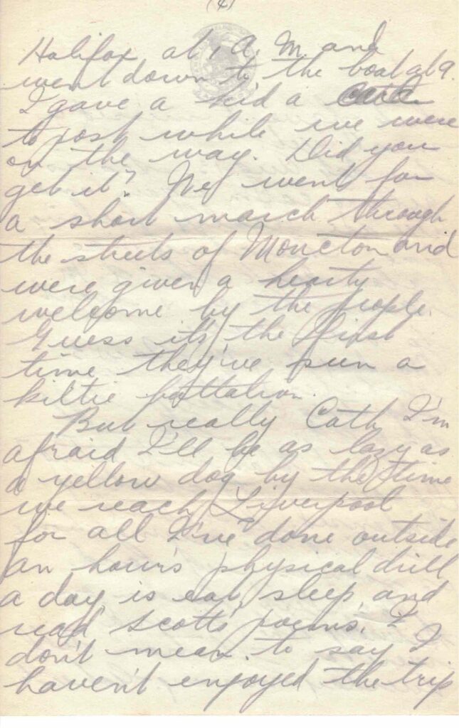 We left Borden on Saturday the 5th and were on the train till Tuesday morning. Got into Halifax at 1 a.m. and went down to the boat at 9. I gave a kid a card to post while we were on the way. Did you get it? We went for a short march through the streets of Moncton and were given a hearty welcome by the people. Guess it’s the first time they’ve seen a kiltie battalion.