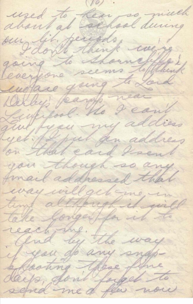 I don’t think we’re going to Shorncliffe; everyone seems to think we are going to Lord Derby’s camp near Liverpool. So I can’t give you my address yet. I put an address on that card I sent you though so my mail addressed that will get me in time although it will take longer for it to reach me.