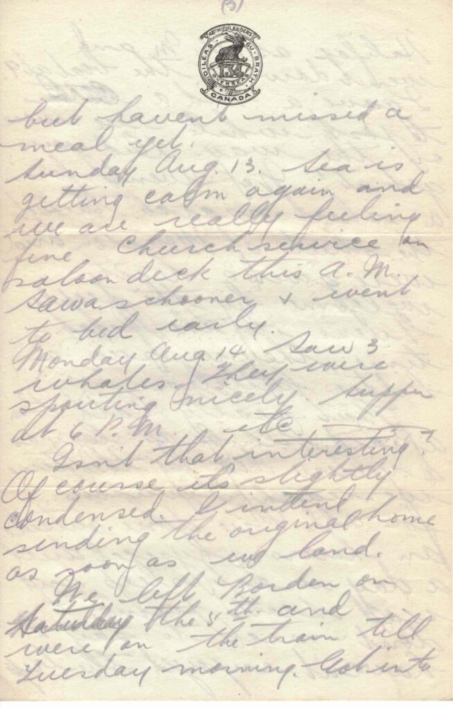 Sat. Aug. 12. Sea is getting rather rough & boat is rolling nicely. Feel rather weak at the knees. Lawrence says he feels O.K. but I think he feels rather pale just the same. He looks the part any way. I know this much – he had four meals today – 2 down & 2 up – but I didn’t see him at the supper table. Think I’ll be feeding the fishes before long but haven’t missed a meal yet.