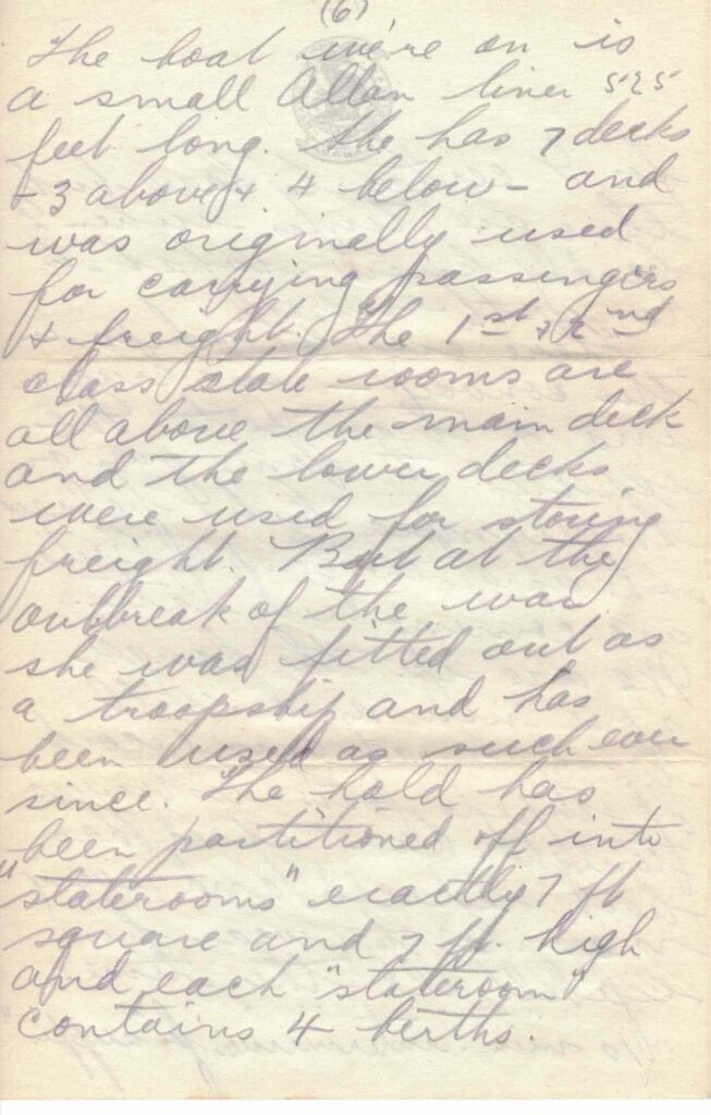 The boat we’re on is a small Allan liner 525 feet long. She has 7 decks – 3 above & 4 below – and was originally used for carrying passengers & freight. The 1st and 2nd class state rooms are all above the main deck and the lower decks were used for storing freight. But at the outbreak of war she was fitted out as a troopship and has been used as such ever since. The hold has been partitioned off into “staterooms” exactly 7 ft. square and 7ft. high and each “stateroom” contains 4 berths.