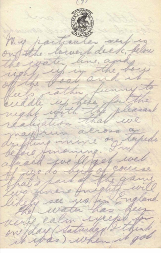 My particular nest is on the lowest deck, below the water line, and right up in the bow of the boat and it feels rather funny to cuddle up here for the night with the pleasant realization that we may run across a drifting mine or torpedo before morning. I’m afraid we’ll all get wet if we do but of course that’s part of the game. Two more nights will likely see us in England.