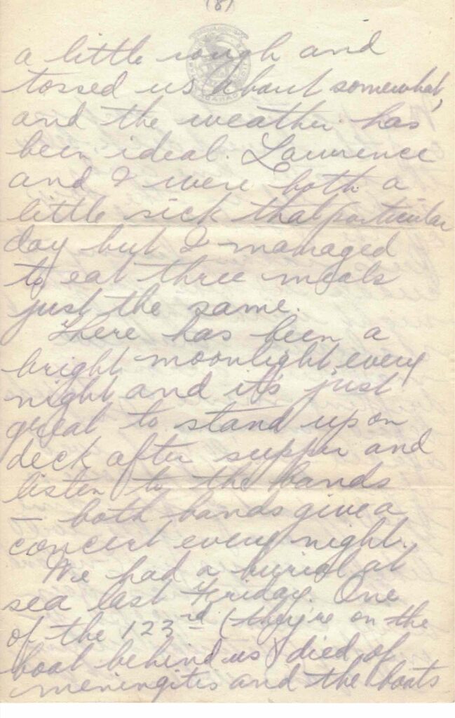 We had a burial at sea last Friday. One of the 123rd (they’re on the boat behind us) died of meningitis and the boats all stopped a few minutes while a short service was read and the body dropped over the side. The troops were all lined up on deck and our pipes played a lament.