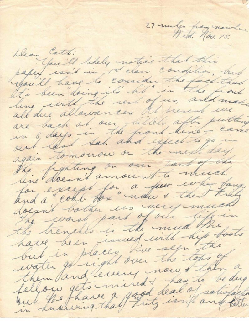 You’ll likely notice that this paper isn’t in 1st class condition, but you’ll have to consider the fact that it’s been “doing its’ bit” in the front line with the rest of us, and make all due allowances. At present we are back at our billets after putting in 8 days in the front line – came out last Sat. and expect to go in again tomorrow or the next day. The fighting on our part of the line doesn’t amount to much for expect for a few whiz-bangs and “coal-box” now & then Fritz doesn’t bother us very much. The worst part of our life in the trenches is the mud. We have been issued with hip boots but in places I’ve seen the water go right over the tops of them and every now & then a fellow gets mired & has to be dug out. We have a good deal of satisfaction in knowing that Fritz isn’t any better off though. We can sometimes see him up on the parapet baling the water out of his trench in broad daylight.