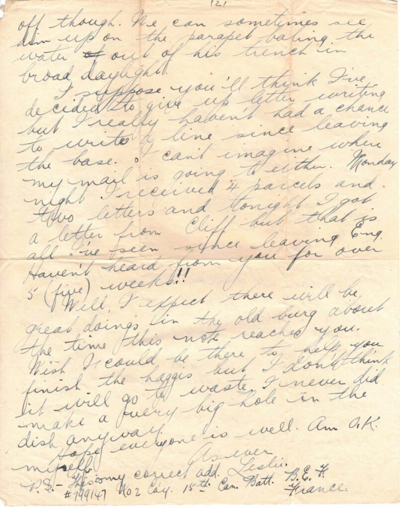 I suppose you’ll think I’ve decided to give up letter writing but I really haven’t had a chance to write a line since leaving the base. I can’t imagine where my mail is going to either. Monday night I received 4 parcels and two letters and tonight I got a letter from Cliff but that is all I’ve seen since leaving Eng. Haven’t heard from you for over 5 (five) weeks!!