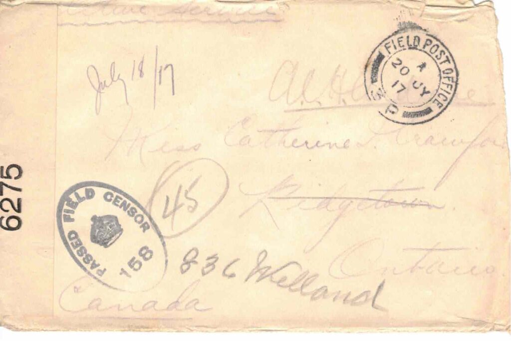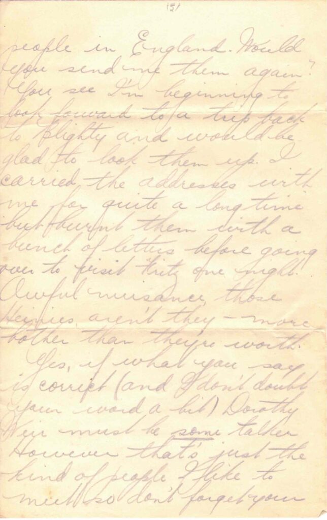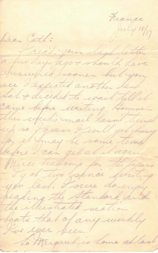 So Margaret is home at last eh. She certainly did arrive at the wrong time though – she should have waited till after you had finished your exams. It’s pretty hard lines to come home for a couple of months holiday and have to start right in washing dishes. I expect she will be getting ready to go back to school again when you get this. Where is she going to teach? And I suppose you will be off to Toronto this fall. Well don’t forget to send me your address [and?] you perhaps remember the addresses your mother sent me last winter – addresses of some of your people in England. Would you send me them again? You see I’m beginning to look forward to a trip back to Blighty and would be glad to look them up. I carried the addresses with me for quite a long time but burnt them with a bunch of letters before going over to visit Fritz one night. Awful nuisance, those Heinies, aren’t they – more bother than they’re worth.