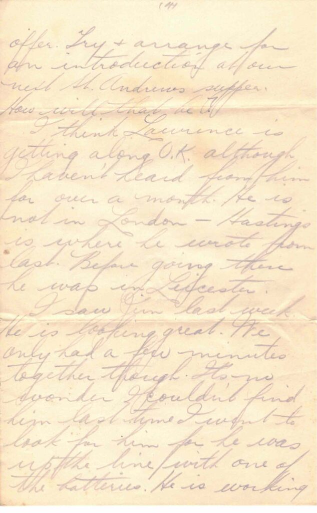 I think Lawrence is getting along O.K. although I haven’t heard from him for over a month. He is not in London – Hastings is where he wrote from last. Before going there he was in Leicester.