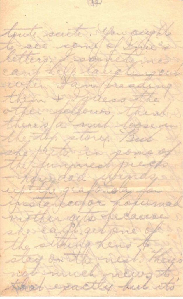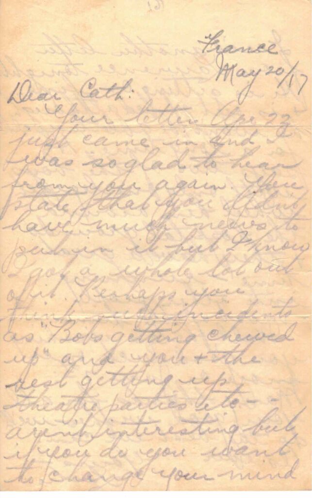 Your letter Apr. 22 just came in and I was so glad to hear from you again. You state that you didn’t have much news to put in it but I know I got a whole lot out of it. Perhaps you think such incidents as “Bobs getting chewed up” and you & the rest getting up theatre parties etc. – aren’t interesting but if you do you want to change your mind toute suite. You ought to see some of Ine’s letters. I sometimes can’t help laughing out when I am reading them & I guess the other fellows think there’s a nut loose in the top story. But she puts in some of the funniest pieces – how dad winds up the grafinola for instance or how mad mother gets because she can’t get one of the sitting hens to stay on the nest. There’s not much news to that exactly but it’s amusing just the same as well as interesting.