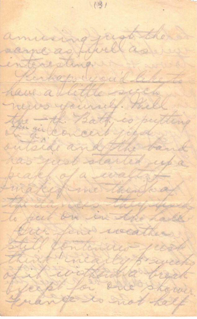 Perhaps you’d like to have a little such news yourself. Well the –th Batt is putting on a open air concert just outside and the band has just started up a peach of a waltz – makes me think of the dances they used to put on in the hall.