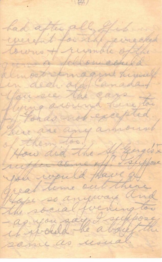 Our fine weather still continues – just think! Nearly 5 weeks of it without a break except for one shower. France is not half bad after all. If it weren’t for the wrecked towns & rumble of the guns a fellow could almost imagine himself in dear old Canada. You see the cars flying around here too – Fords not excepted. There are any amount of them too.