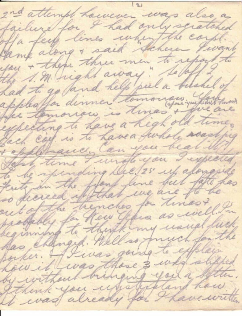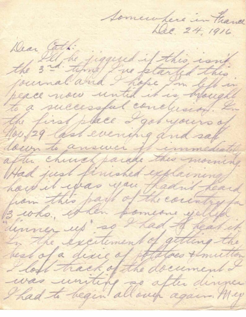 I’ll be jiggered if this isn’t the 3rd time I’ve started this journal and I hope I’m left in peace now until it is brought to a successful conclusion. In the first place I got yours of Nov. 29 last evening and sat down to answer it immediately after church parade this morning. Had just finished explaining how it was you hadn’t heard from this part of the country for 3 wks, when someone yelled “dinner up” so I had to beat it. In the excitement of getting the best of a dixie of potatoes & mutton I lost track of the document I was writing so after dinner I had to begin all over again. My 2nd attempt however was also a failure for I had only scratched off a few lines when the corpl. came along & said “Scherer I want you & these three men to report to the S.M. right away.” So off I had to go and help peel a bushel of apples for dinner tomorrow. You see tomorrow is Xmas (spose you didn’t know) & we are expecting to have a high old time. Each co’y is to have a whole roast pig & apple sauce. Can you beat it? Last time I wrote you I expected to be spending Dec. 25 up alongside Fritz in the front line but fate has so decreed it that we are to be out of the trenches for Xmas & probably for New Years as well. I’m beginning to think my usual luck has changed. Well so much for the porker. – I was going to explain how it was those 3 wks slipped by without bringing you a letter. I think you understand how it was already for I have written you 2 or 3 times since and explained that it was impossible to write letters in the front line and during the 1st trip in I couldn’t get any cards. I can’t make my explanation any clearer than that for to do so would call for a whole string of literature that would likely be jumped on by the censor with both feet. I got a fine calling down from Ine in a letter that arrived this A.M. on a/c those same 3 wks so you see I am getting it from all sides – oh yes. Ruby had to call my attention to the matter & also Whit. I try to write you & the folks at home once a week – a card when in the trenches & a letter when out – but if I miss a week now & then you will know that I can’t get hold of a card, and not come to the conclusion that I have looked over the top once too often.