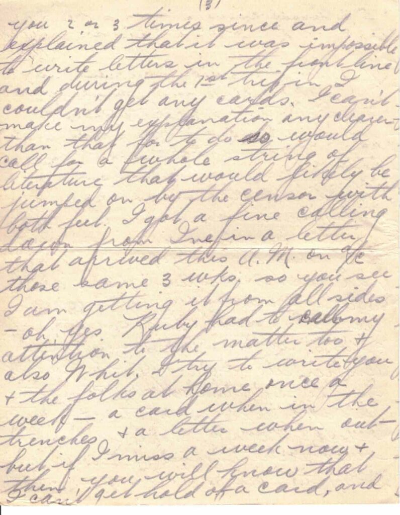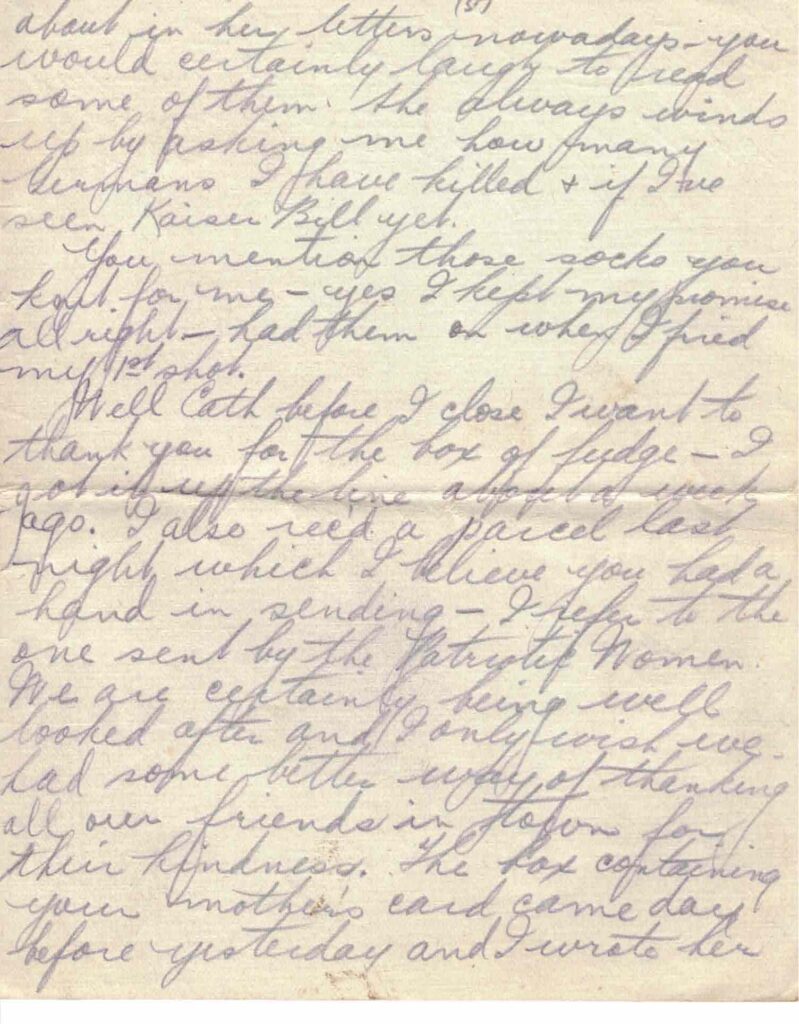 Well Cath before I close I want to thank you for the box of fudge – I got it up the line about a week ago. I also rec’d a parcel last night which I believe you had a hand in sending – I refer to the one sent by the Patriotic Women. We are certainly being well looked after and I only wish we had some better way of thanking all our friends in town for their kindness. The box containing your mother’s card came day before yesterday and I wrote her a line announcing its safe arrival. Hope the letter reaches its destination.