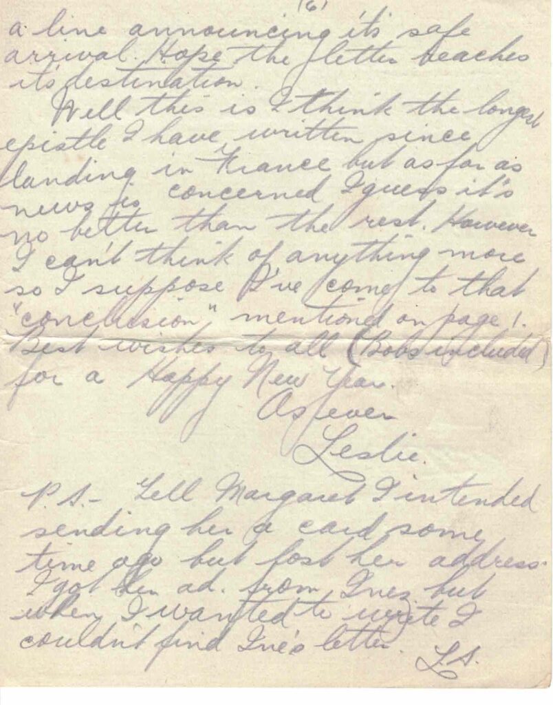 Well this is I think the longest epistle I have written since landing in France but as far as news is concerned I guess it’s no better than the rest. However I can’t think of anything more so I suppose I’ve come to that “conclusion” mentioned on page 1. Best wishes to all (Babs included) for a Happy New Year.