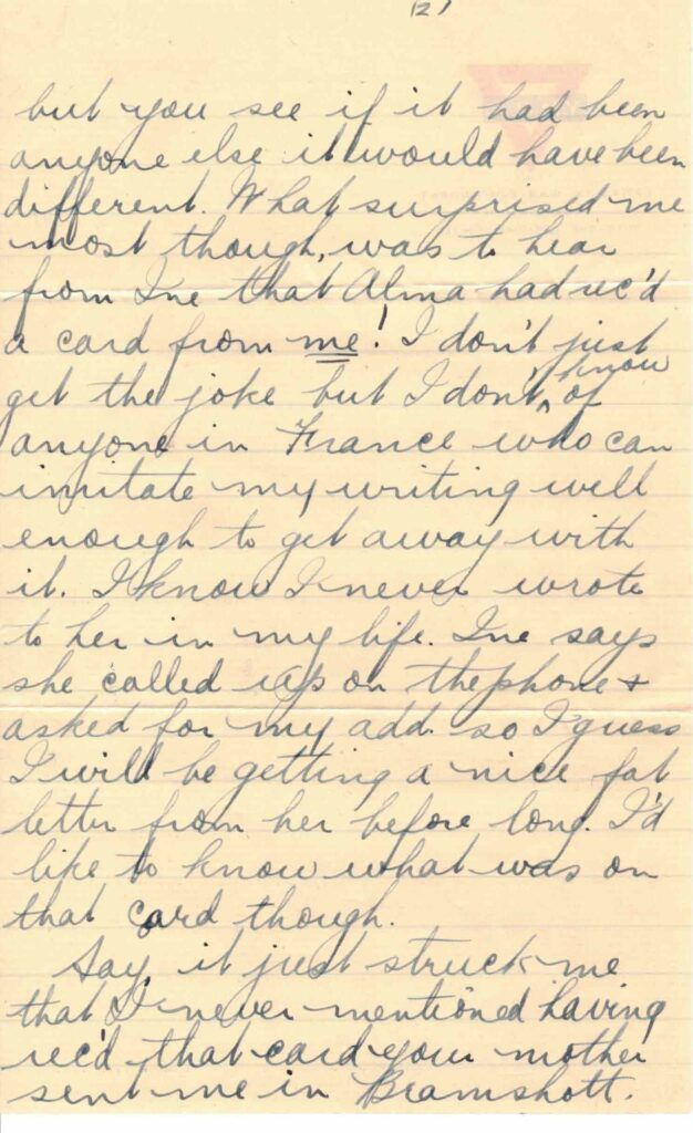 Your letter of Nov. 9th arrived a couple of evenings ago and was it welcome? Oh no! You see we had just come out of the trenches after putting in 12 days there and nothing suits me better when I am feeling tired than to roll up in my blanket and read a letter from the old town. I also got one from Harry & one from Ine the same night, so you see I was pretty well fixed eh, what? I was rather amused at that little accident which happened to Alma B. (perhaps you won’t admire my sense of humor) but you see if it had been anyone else it would have been different. What surprised me most though, was to hear from Ine that Alma had rec’d a card from me! I don’t just get the joke but I don’t know of anyone France who can imitate my writing well enough to get away with it. I know I never wrote to her in my life. Ine says she called up on the phone & asked for my add. So I guess I will be getting a nice fat letter from her before long. I’d like to know what was on that card though.