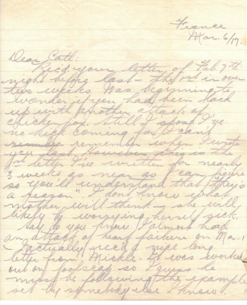 Say do you know I almost had an attack of heart failure on Mar.1 – I actually rec’d a nice long letter from Mickle. It was worked out on foolscap so I guess he must be following the example set by somebody else I know.