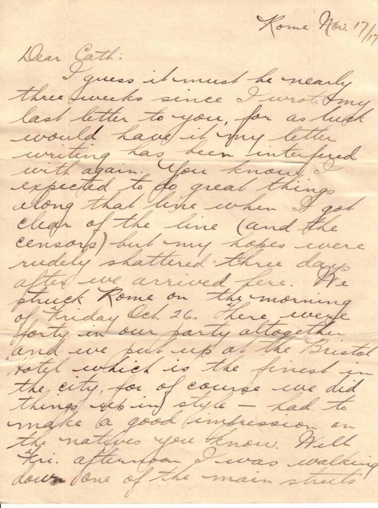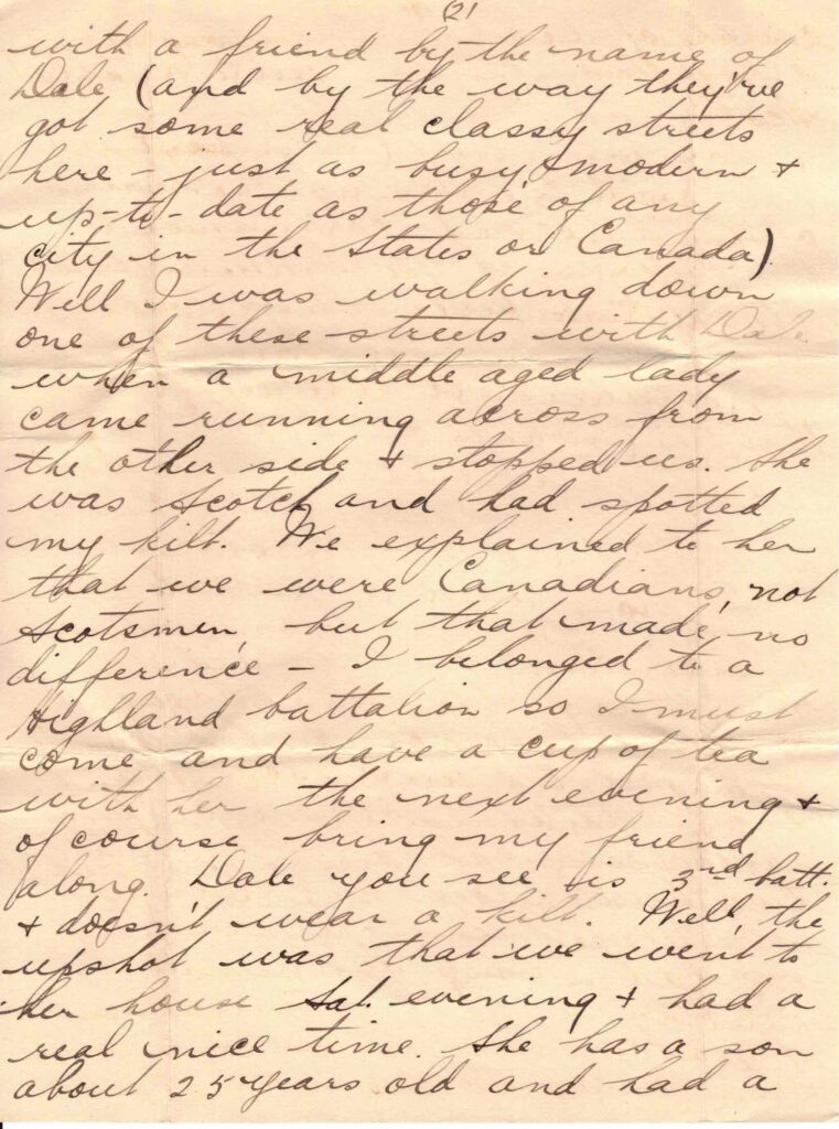 I guess it must be nearly three weeks since I wrote my last letter to you for as luck would have it my letter writing has been interfered with again. You know I expected to do great things along that line when I got clear of the line (and the censors) but my hopes were rudely shattered three days after we arrived here. We struck Rome on the morning of Friday Oct 26. There were forty in our party altogether and we put up at the Bristol Hotel which is the finest in the city, for of course we did things up in style – had to make a good impression on the natives you know. Well Fri. afternoon I was walking down one of the main streets with a friend by the name of Dale (and by the way they’ve got some real classy streets here – just as busy, modern, and up-to-date as those of any city in the States or Canada). Well I was walking down one of these streets with Dale when a middle aged lady came running across from the other side & stopped us. She was Scotch and had spotted my kilt. We explained to her that we were Canadians, not Scotsmen, but that made no difference – I belonged to a Highland battalion so I must come and have a cup of tea with her the next evening & of course bring my friend along. Dale you see is 3rd batt. & doesn’t wear a kilt. Well, the upshot was that we went to her house Sat. evening & had a real nice time. She has a son about 25 years old and had a couple of ladies too, so altogether it was quite a jolly party.