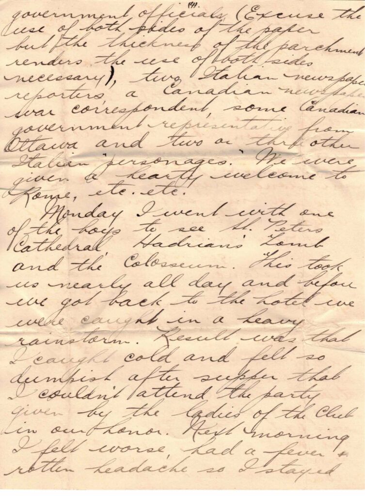 Sunday the bunch went to the catacombs but I wasn’t feeling extra well so I went to the British soldiers club & wrote some post cards & started a letter to you but didn’t get it finished. In the evening we had a big dinner at the hotel to which a number of guests were invited among them being some noted Italian government officials (Excuse the use of both sides of the paper but the thickness of the parchment renders the use of both sides necessary), two Italian newspaper reporters, a Canadian newspaper war correspondent, some Canadian government representatives from Ottawa and two or three other Italian personages. We were given a hearty welcome to Rome, etc. etc.