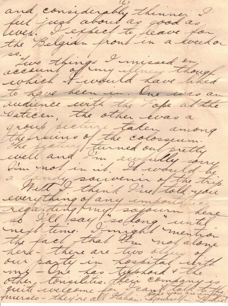 Well I think I’ve told you everything of any importance regarding my sojourn here so I’ll say “so long” until next time. I might mention the fact that I’m not alone here – there are two others of our party in hospital with me – One has typhoid & the other tonsillitis. Their company is quite welcome for I can’t talk to the nurses – they’re all Italian. Hope you are enjoying yourself.