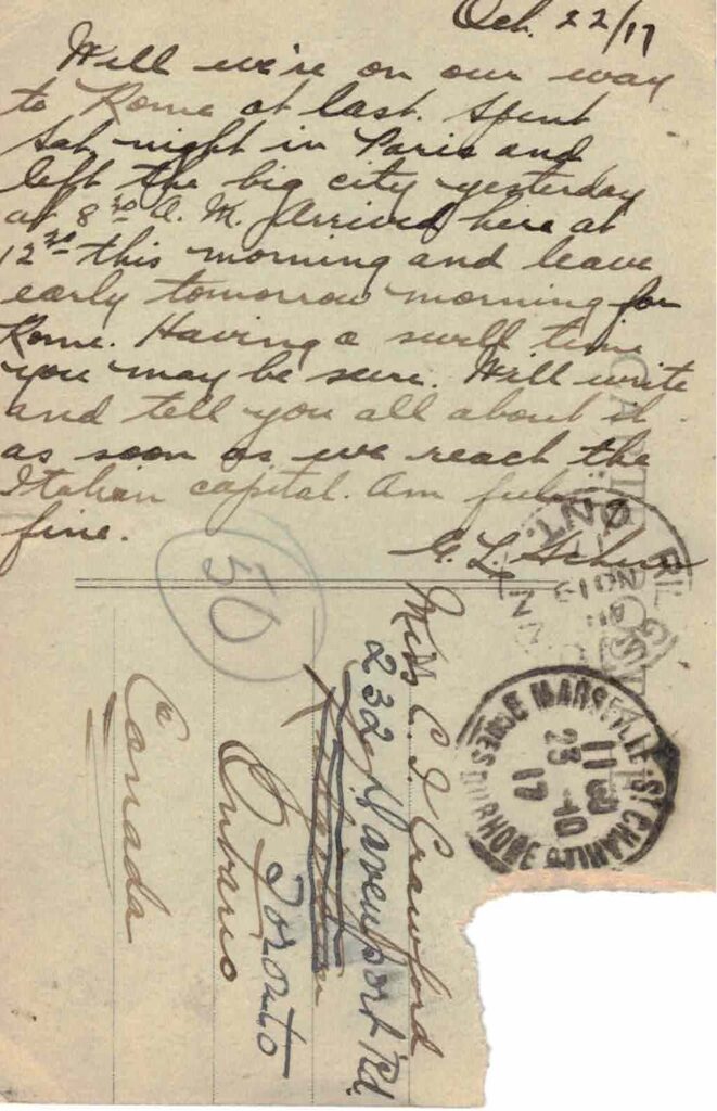 Well we’re on our way to Rome at last. Spent Sat night in Paris and left the big city yesterday at 8:30 a.m. Arrived here at 1230 this morning and leave early tomorrow morning for Rome. Having a swell time you may be sure. Will write and tell you all aboutit as soon as we reach the Italian capital. Am feeling fine. G.L. Scherer