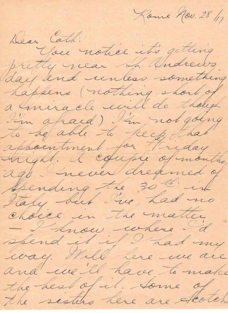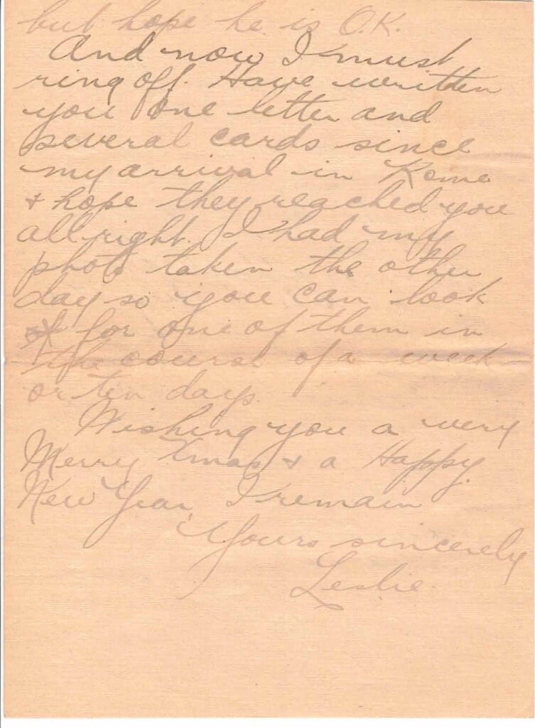 You notice it’s getting pretty near St. Andrews day and unless something happens (nothing short of a miracle will do though I’m afraid) I’m not going to be able to keep that appointment for Friday night. A couple of moths ago I never dreamed of spending the 30th in Italy but I’ve had no choice in the matter – I know where I’d spend it if I had my way. Well here we are and we’ll have to make the best of it. Some of the sisters here are Scotch are all nuns. They are all British and are very nice indeed. They have charge of the place. The nurses (most of them are in training here) are Italian and only one or two can talk English but they certainly have looked after us well during the time we’ve been here. We’re still staying at the hospital but have been convalescent for over a week and go down town every day.