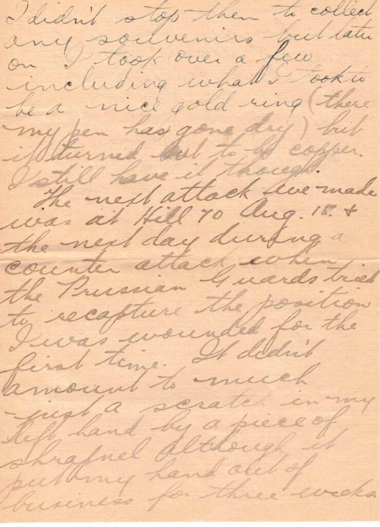 The next attack we made was at Hill 70 Aug. 18 & the next day during a counter attack when the Prussian Guards tried to recapture the position I was wounded for the first time. It didn’t amount to much just a scratch in my left hand by a piece of shrapnel although it put my hand out of business for three weeks.