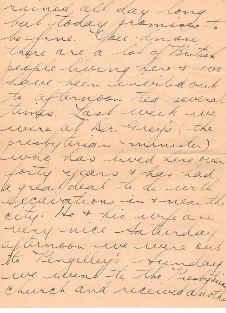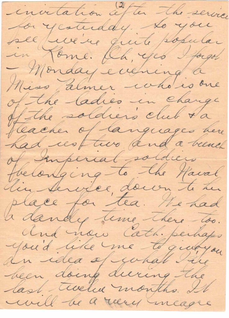 Rome, as I’ve stated before is a dandy city and even at this time of the year the weather is quite warm. Yesterday it rained all day long but today promises to be fine. You know there are a lot of British people living here &we have been invited out to afternoon tea several times. Last week we were at Dr. Grey’s (the Presbyterian minister) who has lived here over forty years & has had a great deal to do with excavations in & near the city. He & his wife are very nice. Saturday afternoon we were out to Pengelly’s. Sunday we went to the Presbyterian church and received another invitation after the service for yesterday. So you see we’re quite popular in Rome. Oh, yes I forgot – Monday evening a Miss Palmer who is one of the ladies in charge of the soldier’s club & a teacher of languages here had us two and a bunch of Imperial soldiers belonging to the Naval Air Service, down to her place for tea. We had a dandy time there too.