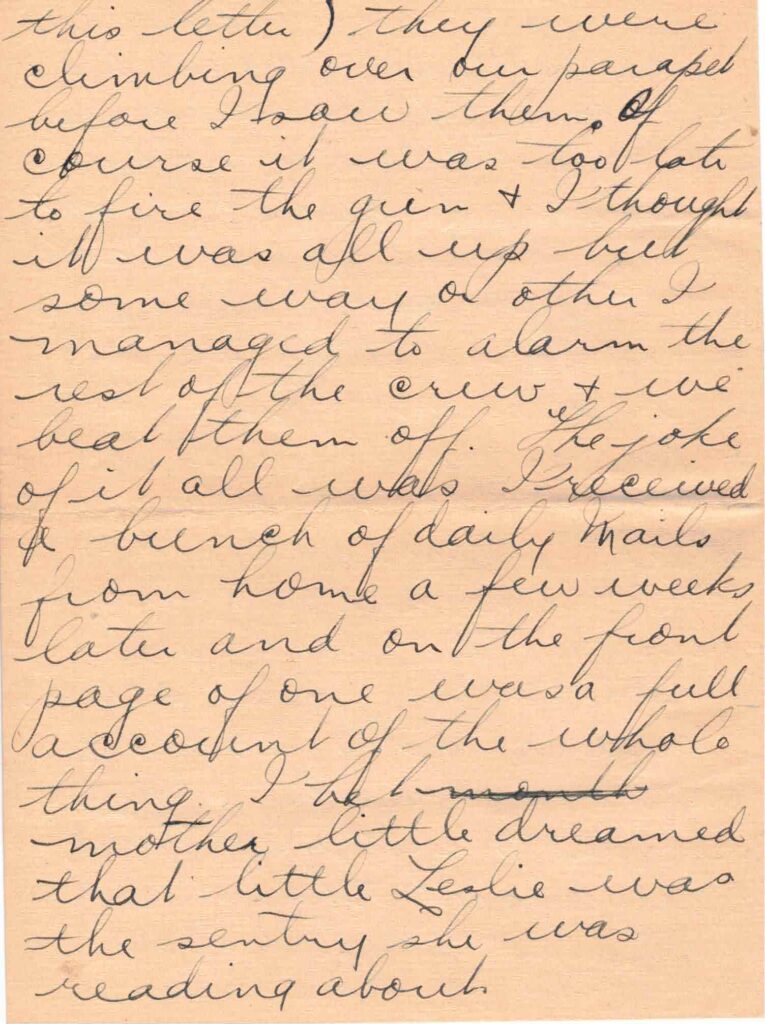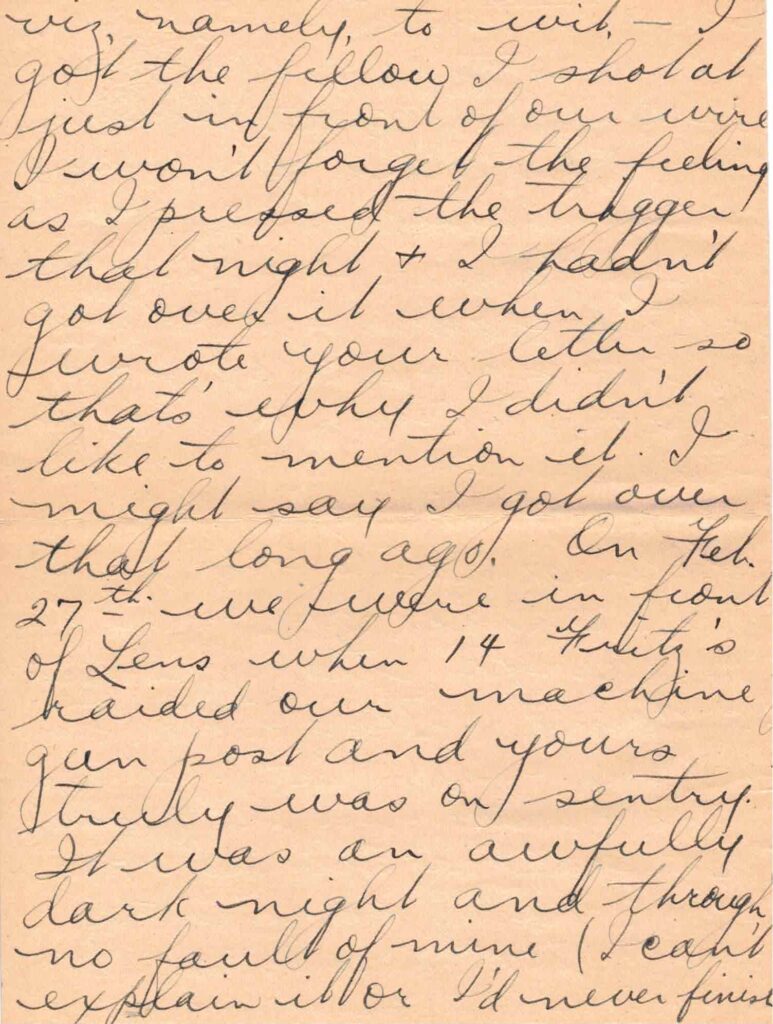 And now Cath. Perhaps you’d like me to give you an idea of what I’ve been doing during the last twelve months. It will be a very meager account but I can tell you where we’ve been & some of the shows we’ve taken hand in which I won’t be able to do when I get back to the front. I made my first trip in the trenches at Vimy Ridge & for mud that piece of line had them all beat. I fired my 1st shot the second night just after midnight – you remember I was wearing the socks you gave me ha! Ha! Well when I wrote *& told you about last winter I didn’t tell you the whole story viz, namely, to wit – I got the fellow I just in front of our wire I won’t forget the feeling as I pressed the trigger that night & I hadn’t got over it when I wrote your letter so that’s why I didn’t like to mention it. I might say I got over that long ago. On Feb. 27th we were in front of Lens when 14 Fritz’s raided our machine gun post and yours truly was on sentry. It was an awfully dark night and through no fault of mine (I can’t explain it or I’d never finish this letter) they were climbing over our parapet before I saw them. Of course it was too late to fire the gun & I thought it was all up but some way or other I managed to alarm the rest of the crew & we beat them off. The joke of it all was I received a bunch of daily mails from home a few weeks later and on the front page of one was a full account of the whole thing. I bet mother little dreamed that Leslie was the sentry she was reading about.