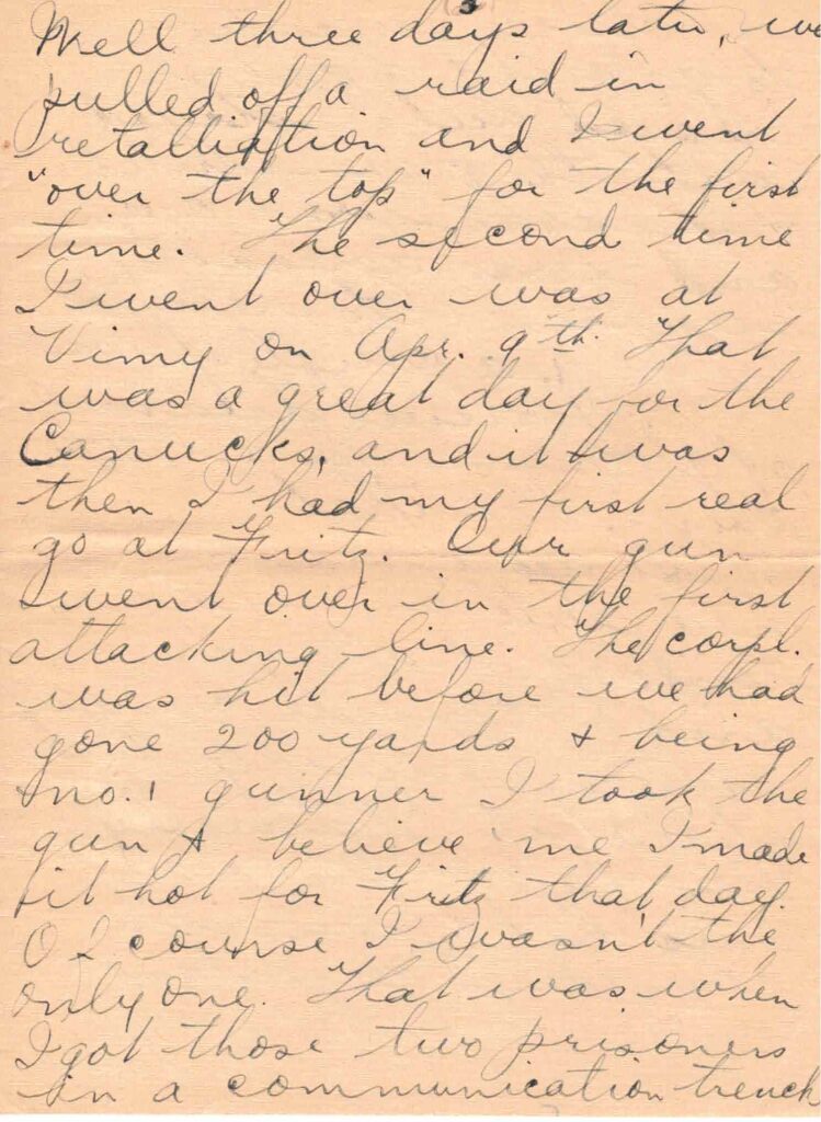 Well three days later, we pulled off a raid in retalliation and I went “over the top” for the first time. The second time I went over was at Vimy on Apr. 9th. That was a great day for the Canucks, and it was then I had my first real go at Fritz. Our gun went over in the first attacking line. The corpl. Was hit before he had gone 200 years & being no.1 gunner I took the gun & believe me I made it hot for Fritz that day. Of course I wasn’t the only one. That was when I got those two prisoners in a communication trench. I didn’t stop them to collect any souvenirs but later on I took over a few including what I took to be a nice gold ring (there my pen has gone dry) but it turned out to be copper. I still have it though.